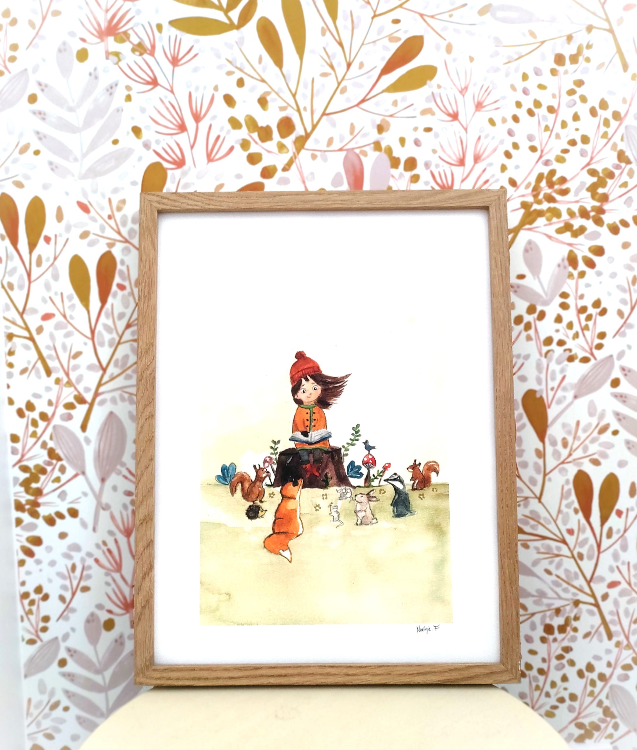 Cette illustration réalisée à l’aquarelle évoque ces instants suspendus, où l’on prend le temps d’observer, d’écouter une histoire et de rêver. Ce tableau est pensé pour accompagner l’enfance et embellir une chambre avec poésie.